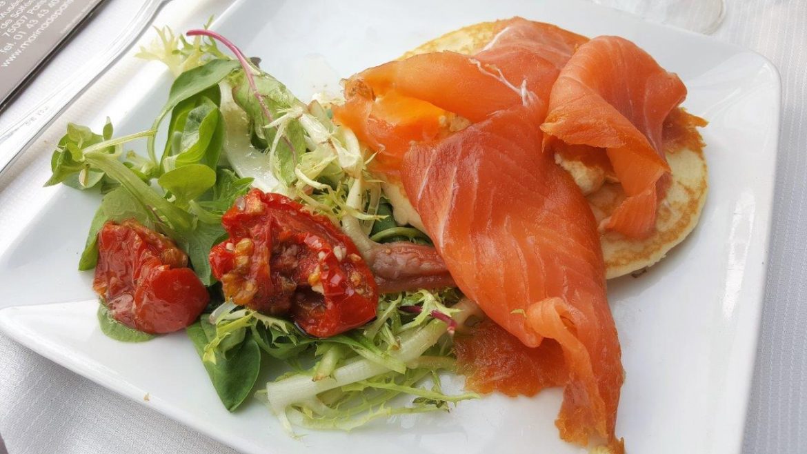 Carpaccio de saumon fumé, tapenade d’artichaut, blinis légèrement acidulé