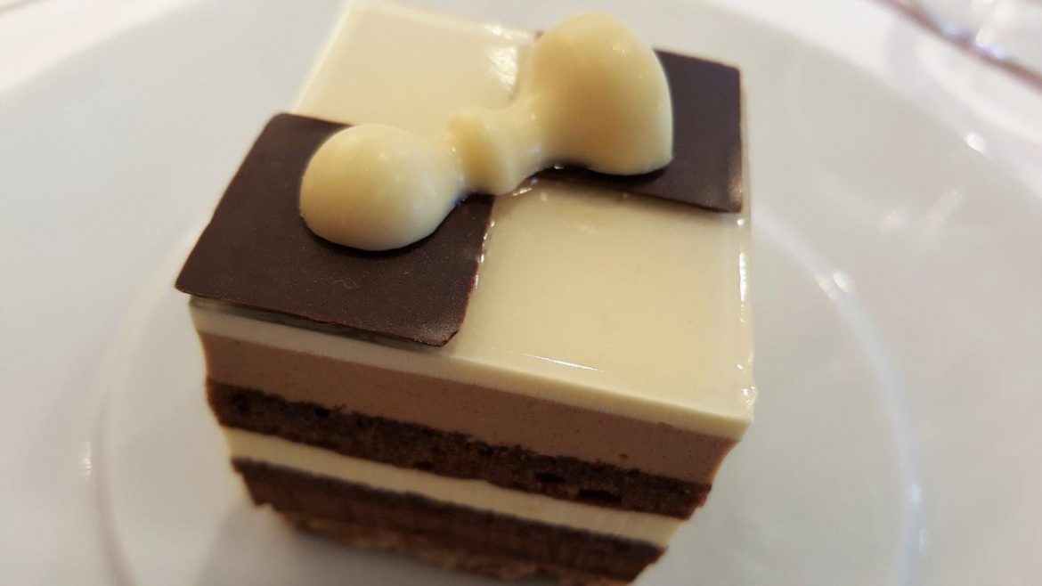 Echiquier (création Dalloyau 1993) : Biscuit aux amandes, génoise au chocolat parfumée à la gousse de vanille Bourbon de Madagascar, déclinaison de trois chocolats : chocolat noir 64% cacao – origine Equateur en chantilly, chocolat blanc et chocolat lait 40% cacao en mousse.