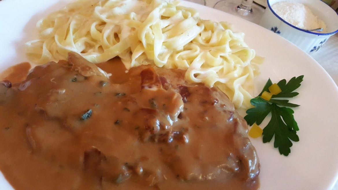 Saltimbocca alla Romana, escalope de veau au jambon de parmesan, sauge, avec tagliatelles à la crème