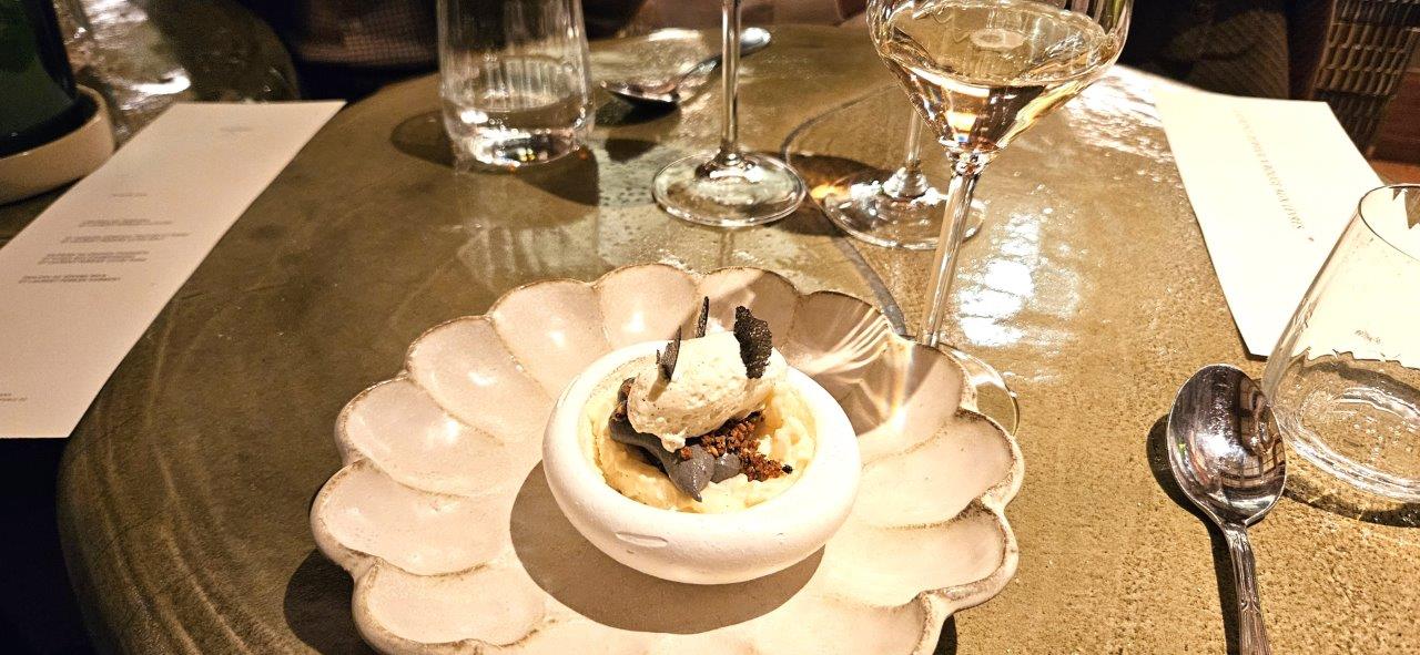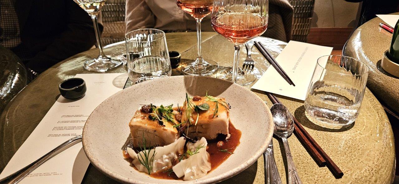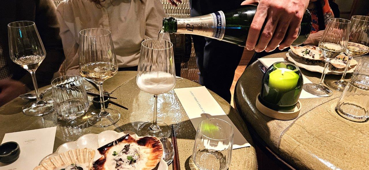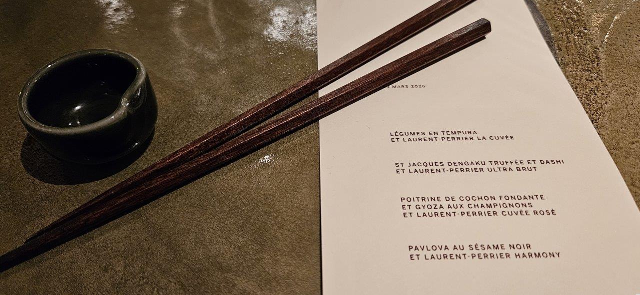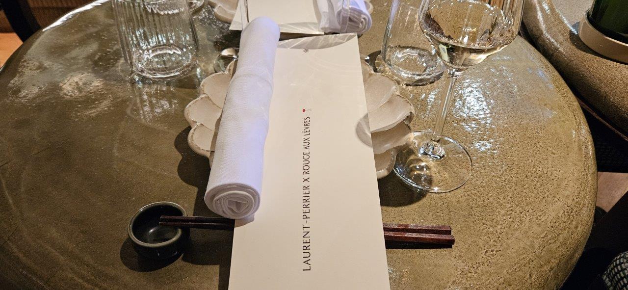 Nous sommes accueillis par un verre de Champagne Laurent-Perrier La Cuvée. Dans la cuvée (BSA), il y a une proportion significative de vins de réserve (liqueur de tirage) pour garantir le profil gustatif et aromatique. Une attaque fraiche avec un cote agrume et une longueur en bouche.