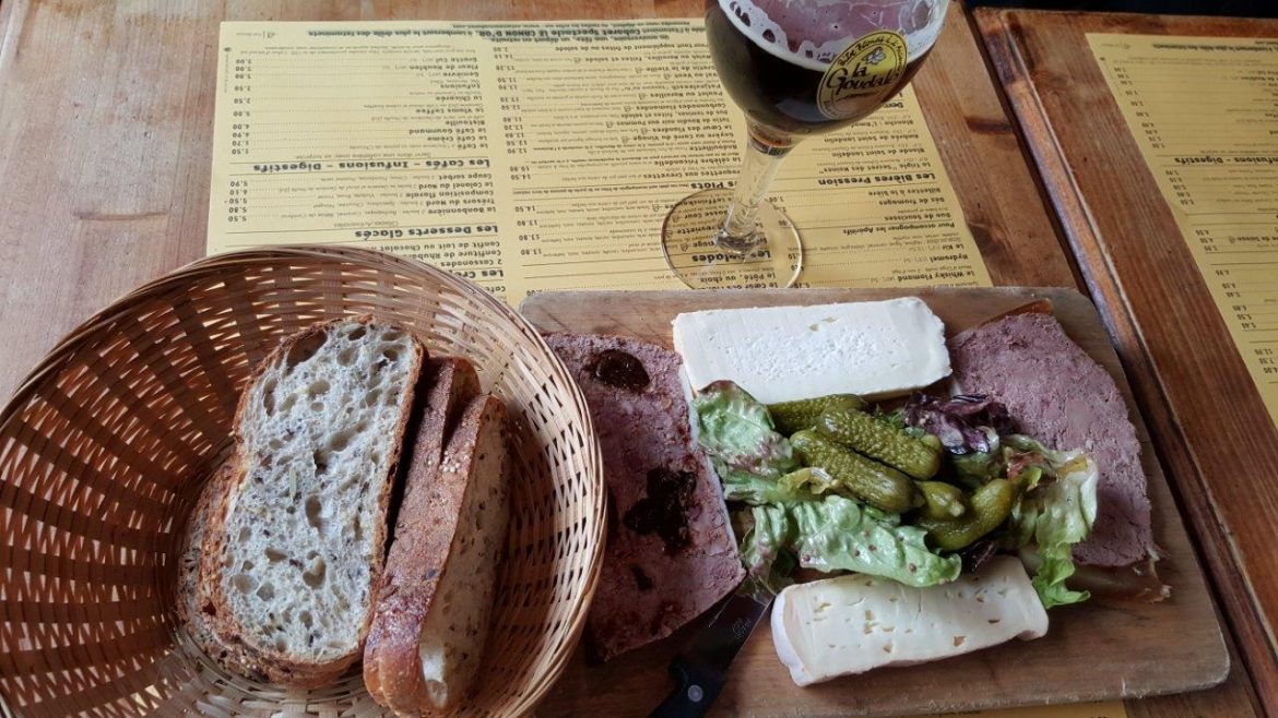 Planche mixte : pâté au pruneaux, pâté aux deux foies, vieux Lille, carré du Vinage