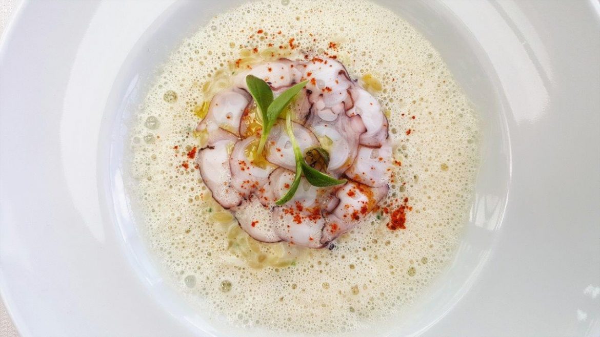 Riso de pâte, couteau et poulpe, écume de coquillage