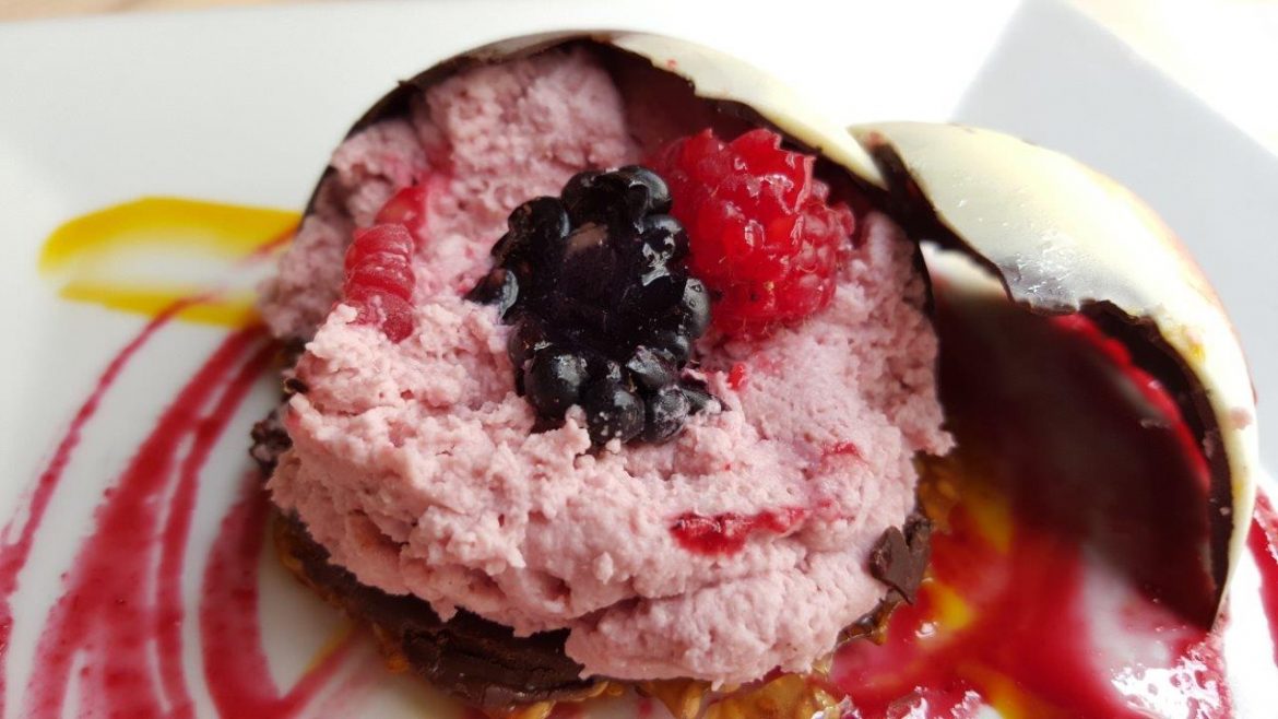 Dôme de chocolat et mousse de fruits rouges, dentelle de sésames aux noisettes